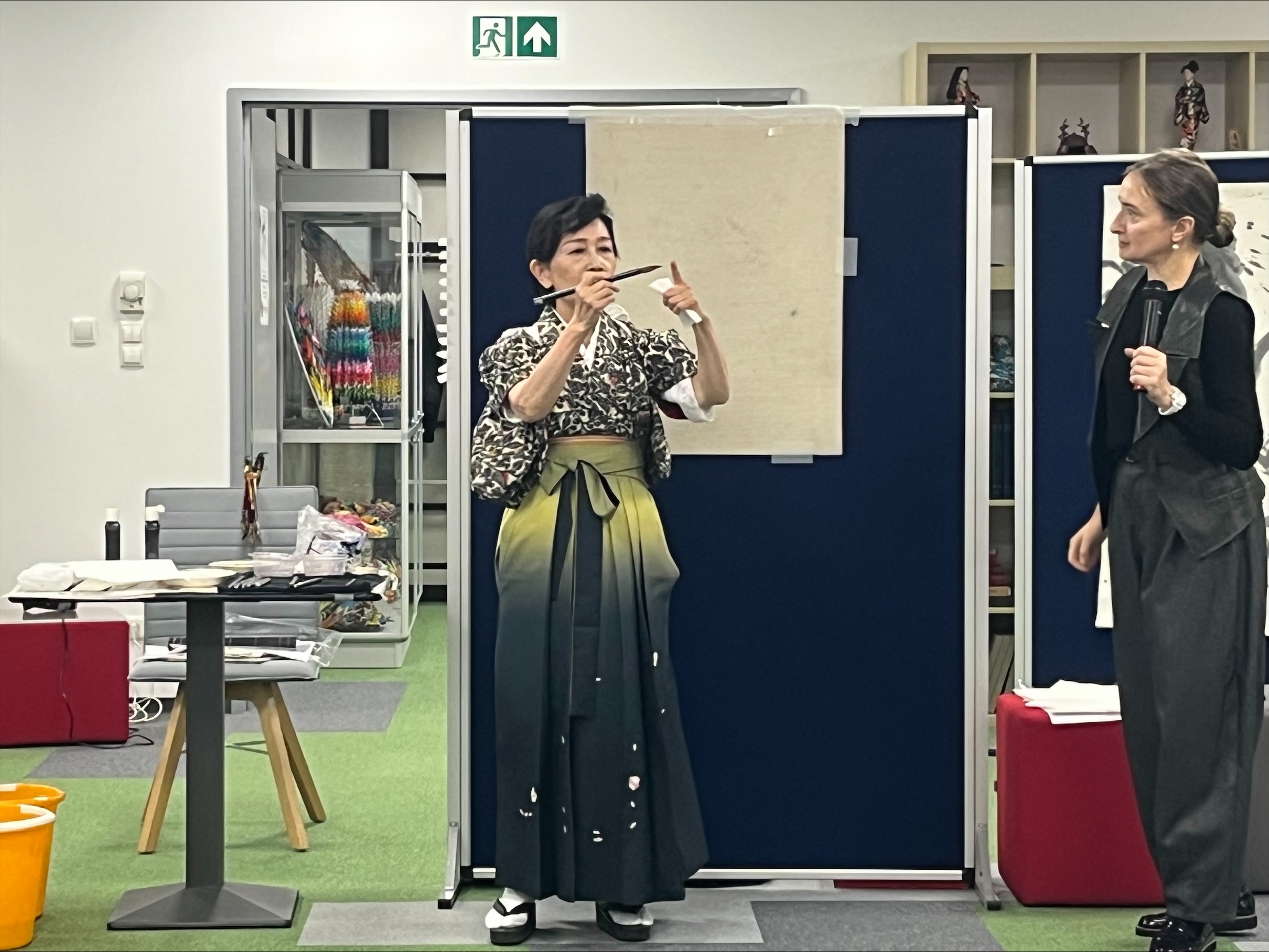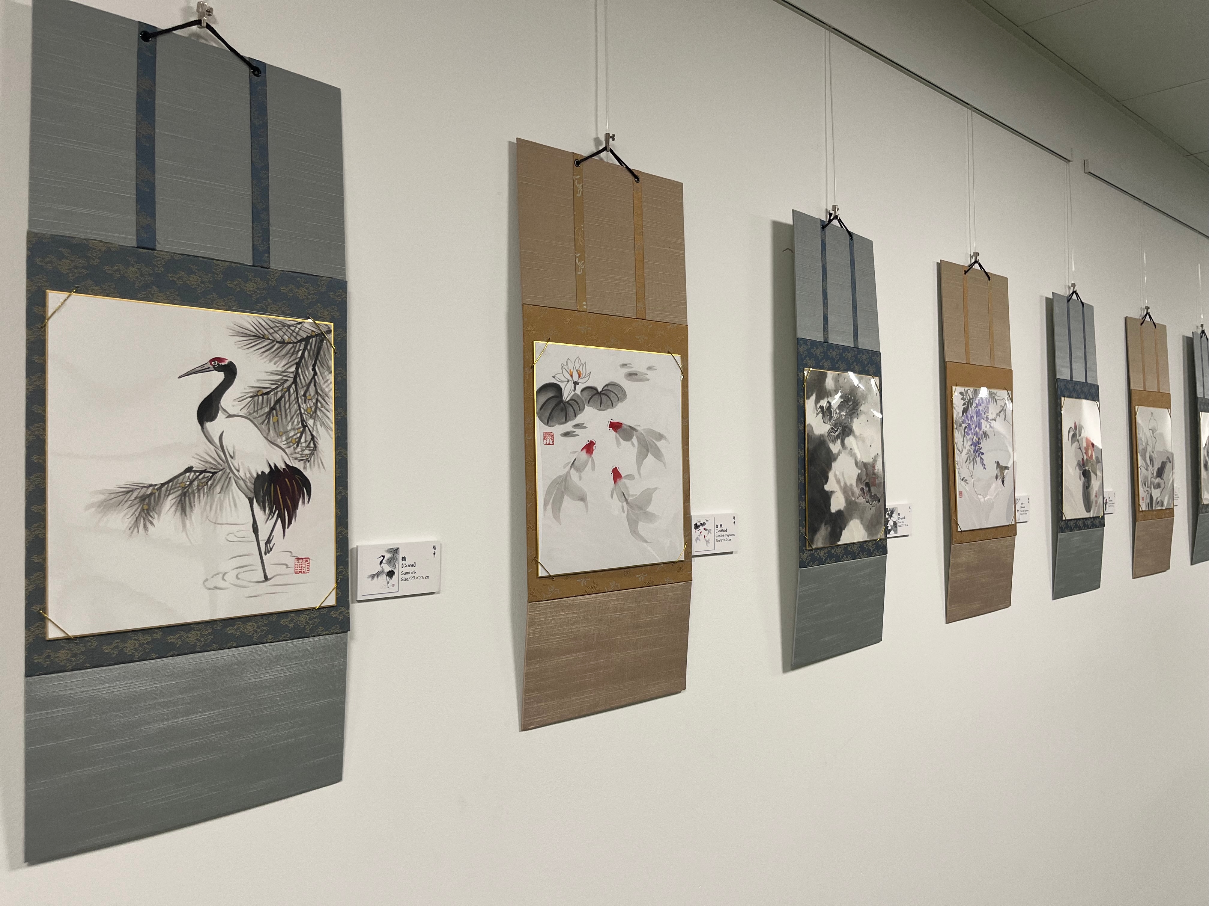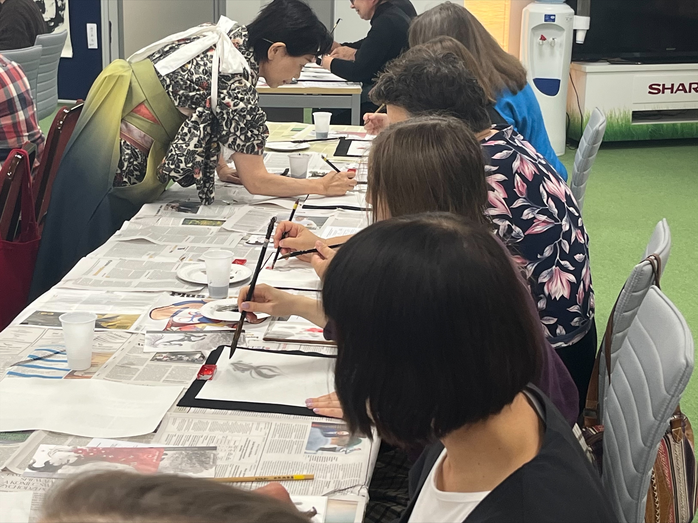 また、7日には水墨墨彩画家の松村龍華氏を講師にお招きし、水墨画ワークショップが開催されました。筆や墨の使い方、水墨画特有の表現などについて解説をいただき、参加者は墨のグラデーションや色を楽しみながら、金魚の作品に挑戦しました。